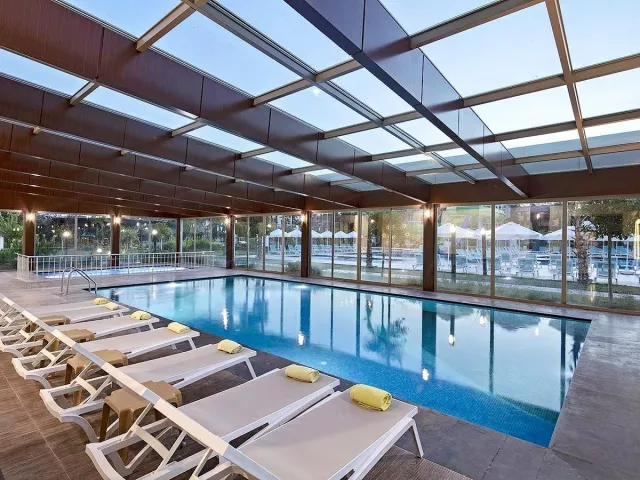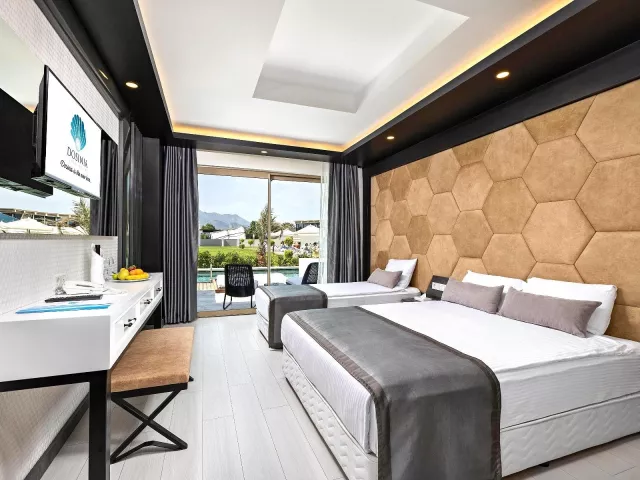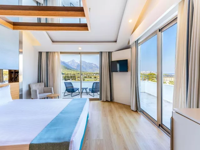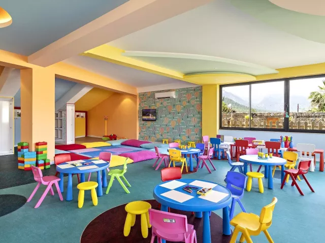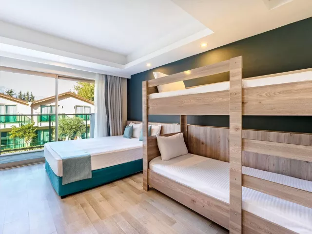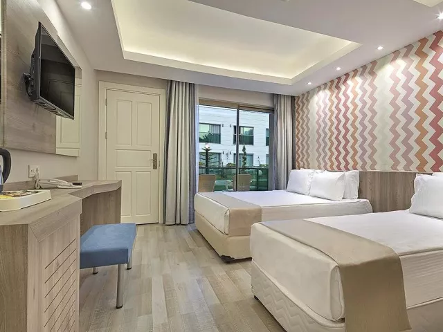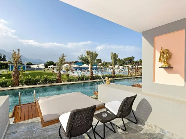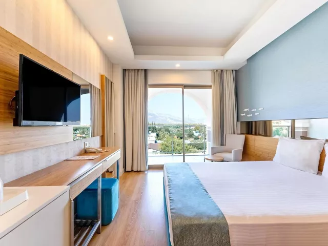 Dvojlôžková izba: kúpeľňa/WC (sušič vlasov), klimatizácia, TV/sat., telefón, minibar (denne dopĺňaný vodou a nealko nápojmi), trezor (zadarmo), set na prípravu kávy a čaju, Wifi (zadarmo), balkón. Môže byť umiestnená v rámci celého areálu hotela. Ostatné typy izieb (pokiaľ nie je uvedené inak, majú izby vyššie uvedené vybavenie): Dvojlôžková izba s bočným výhľadom na more Dvojlôžková izba, hlavná budova: situovaná v hlavnej budove Rodinná izba, 2 spálne: 2 spálne oddelené dverami Dvojlôžková izba Large: priestrannejšia s poschodovou posteľou Dvojlôžková izba SwimUp: s priamym vstupom do bazéna Romantic Suita (Love Suite): rohová izba s terasou a jacuzzi 2 izby prispôsobené pre handicapovaných klientov.