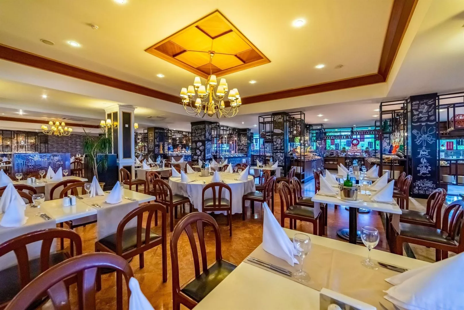 Ponuka stravovania je formou ultra all inclusive, ktorá zahŕňa raňajky, obedy a večere podávané formou bufetu, neskoré raňajky, snacky a rôzne nápoje vrátane miestnych alkoholických a nealkoholických nápojov. K dispozícii sú aj á la carte reštaurácie s rôznymi typmi kuchýň.