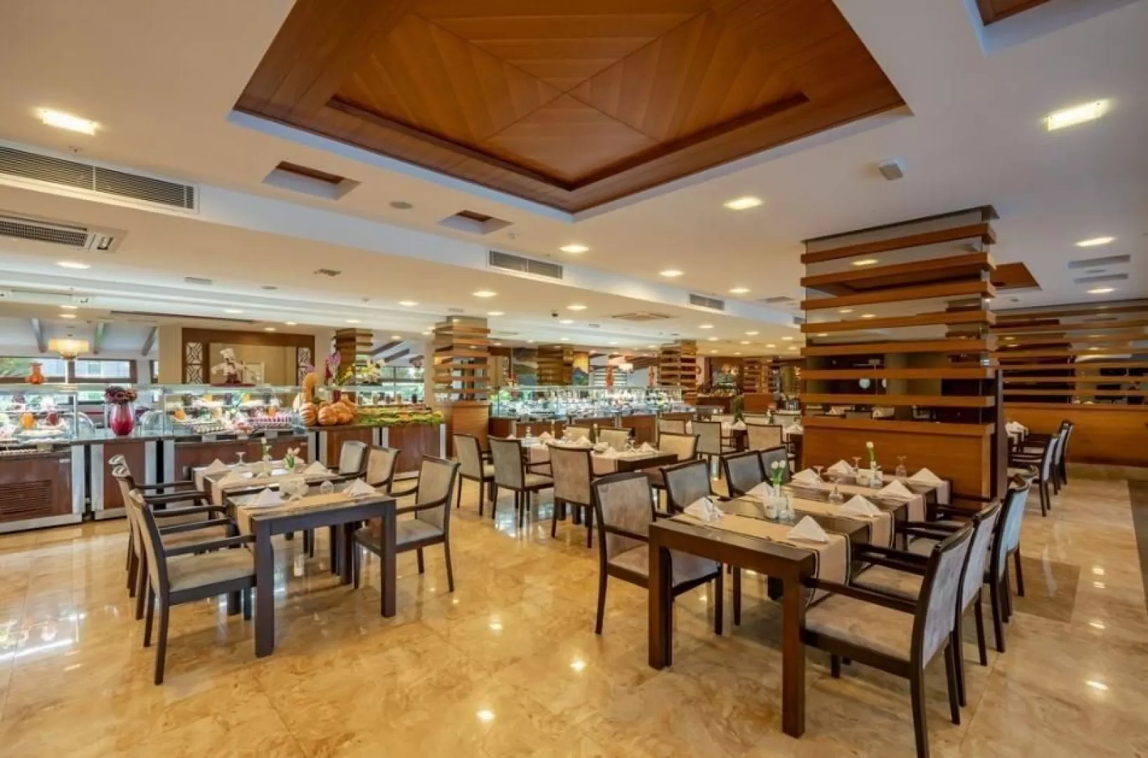 Hotel ponúka koncept all inclusive, ktorý zahŕňa raňajky, obedy a večere formou bufetu, neskoré raňajky a snacky. K dispozícii sú aj à la carte reštaurácie (talianska a rybia) na rezerváciu vopred. Občerstvenie a miestne nápoje sú zahrnuté, avšak niektoré prémiové nápoje sú za poplatok.