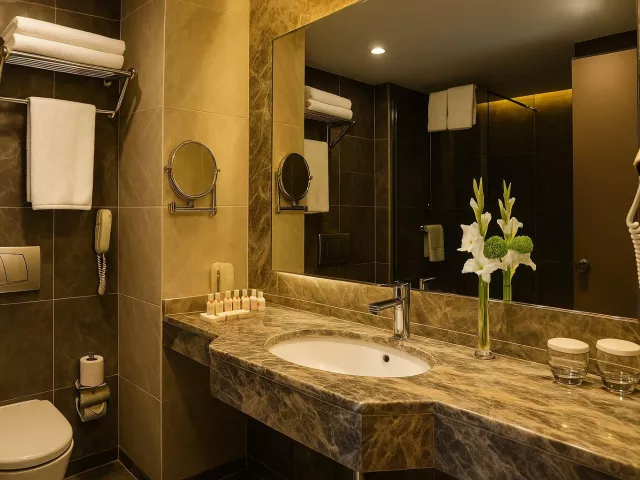 Hotel disponuje 295 izbami, ktoré sú vybavené sprchou, toaletou, klimatizáciou, televízorom, telefónom, minibarom (dopĺňaným každé 2 dni nealkoholickými nápojmi), trezorom, Wi-Fi pripojením, fénom na vlasy, županom a papučami, súpravou na prípravu čaju a kávy a balkónom so sedením.