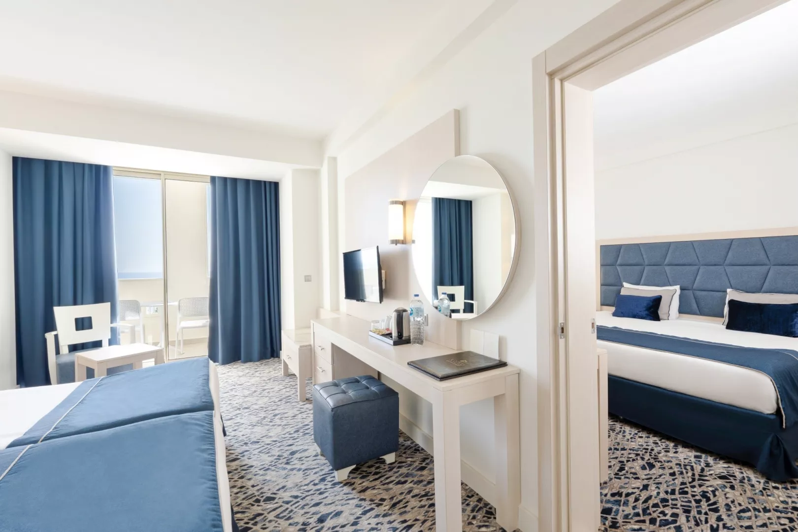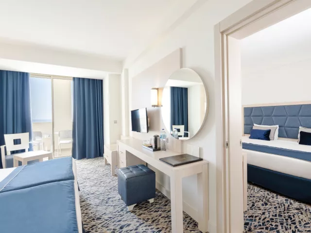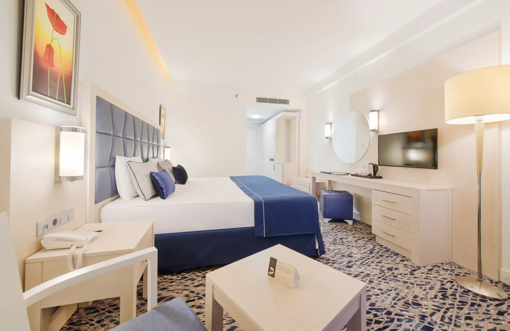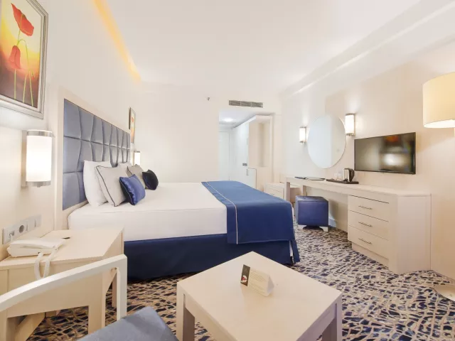 Dvojlôžková izba, Superior centrálne ovládateľná klimatizácia telefón LCD TV so satelitným príjmom minibar (nealkoholické nápoje a pivo po príchode) Wi-Fi (zadarmo) set na prípravu kávy a čaju vlastné sociálne zariadenie (kúpeľňa, sušič vlasov, WC) trezor (zadarmo) balkón Ostatné typy izieb (pokiaľ nie je uvedené inak, majú izby vyššie uvedené vybavenie) Dvojlôžková izba, Superior, strana k moru Rodinná izba, 2 spálne, prepojené, výhľad do záhrady: 2 prepojené izby Rodinná izba, 2 spálne, prepojené, strana k moru: 2 prepojené izby Na vyžiadanie je dvojlôžková izba prispôsobená pre klientov so zdravotným postihnutím. Bezbariérový pohyb v areáli hotela.