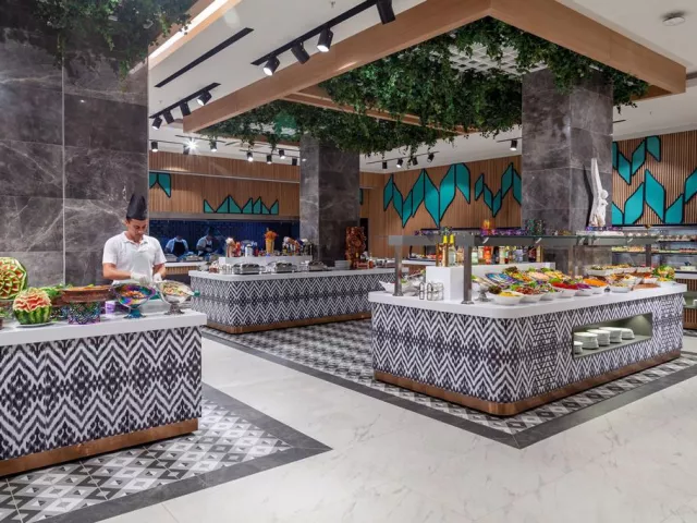 Hotel ponúka ultra all inclusive služby s dostupnosťou 24 hodín denne. Ráno, na obed a večeru sú podávané jedlá formou bufetu s možnosťou neskorých raňajok a popoludňajších snackov. V ponuke sú aj káva, čaj, zákusky a zmrzlina. Á la carte reštaurácie (čínska a stredomorská) sú k dispozícii raz počas pobytu, pričom je nutné predchádzajúce rezervovanie. V bare je ponuka miestnych a niektorých importovaných alkoholických a nealkoholických nápojov, pričom minibar je denne dopĺňaný.