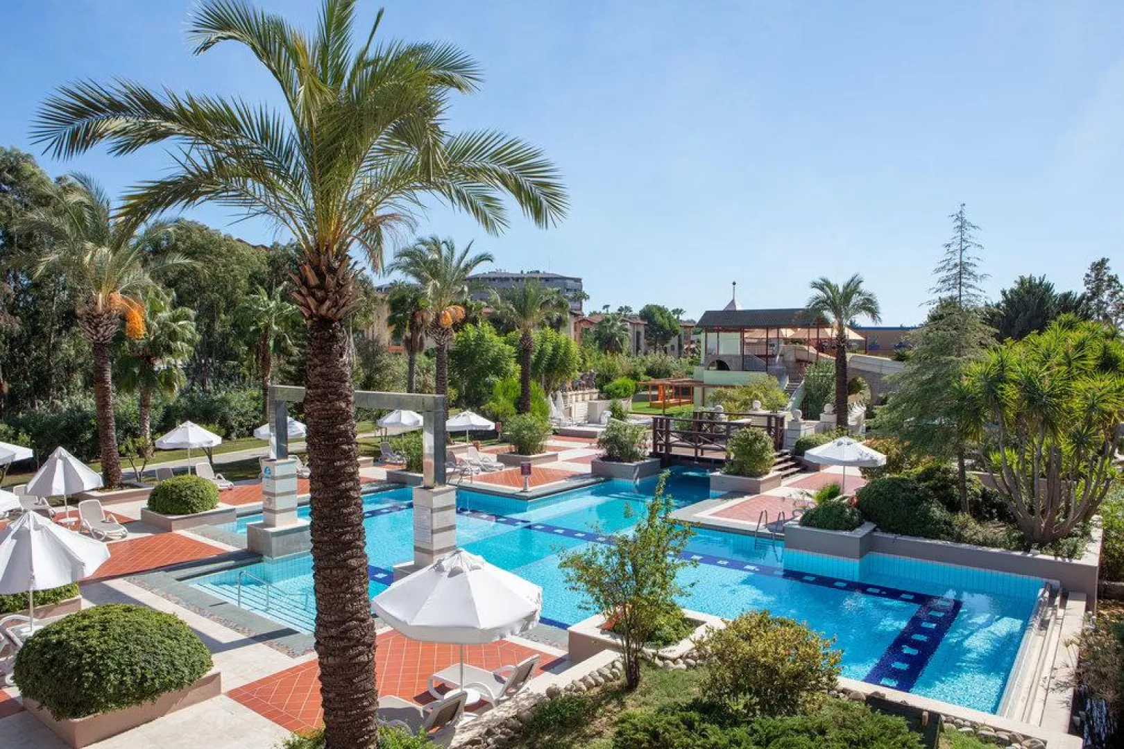 Hotelový komplex pozostáva zo štyroch 4-poschodových budov s celkovým počtom 243 izieb. Medzi zariadenia patrí lobby s WiFi, hlavná reštaurácia, tri á la carte reštaurácie (talianska, turecká a rybia), dva bary, štyri vonkajšie bazény, olympijský plavecký bazén, vnútorný bazén, detský bazén, vnútorný detský bazén a nový aquapark so štyrmi toboganmi. Zariadenia zahŕňajú miniklub a rôzne animačné programy, rovnako ako fitnes, aerobik, plážový volejbal a ďalšie aktivity. Pre záujemcov sú k dispozícii služby ako SPA centrum, masáže, jacuzzi a ďalšie pod podmienkou poplatku.