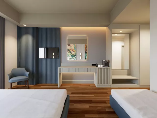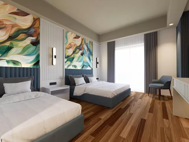 Hotel ponúka celkovo 360 izieb, ktoré sú vybavené balkónom alebo terasou, centrálnou klimatizáciou, SAT TV, minibarom a wifi pripojením. K dispozícii sú rôzne typy izieb: štandardné izby s rozlohou 25-30 m² pre 3 až 4 osoby, rodinné izby s dvoma spálňami a rozlohou 40 m² pre maximálne 4 osoby.