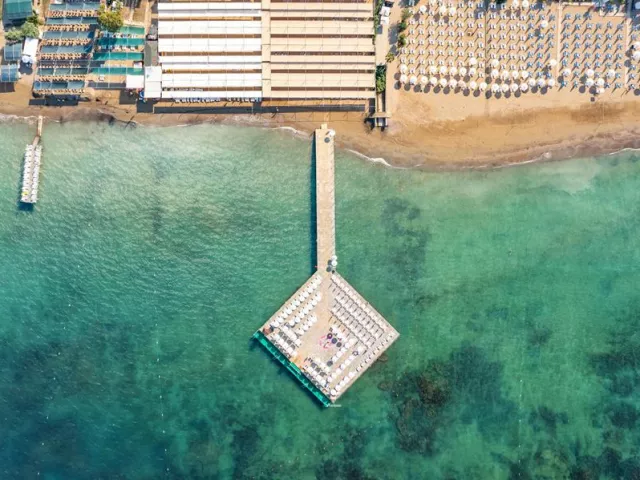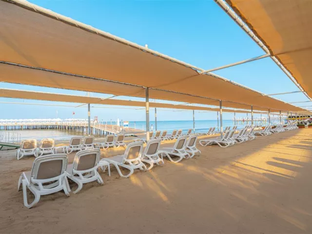 Pláž pri hoteloch je pieskovito-kamienková s mólom. Plážový servis s ležadlami a slnečníkmi je k dispozícii zdarma a vodné športy sa ponúkajú za poplatok.