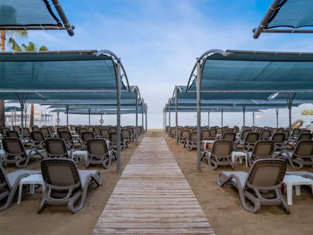 Hotelová piesočná pláž s pozvoľným vstupom do mora je priamo pri hoteli, pričom ležadlá, slnečníky a osušky sú k dispozícii zdarma. Pavilóny sú za poplatok.