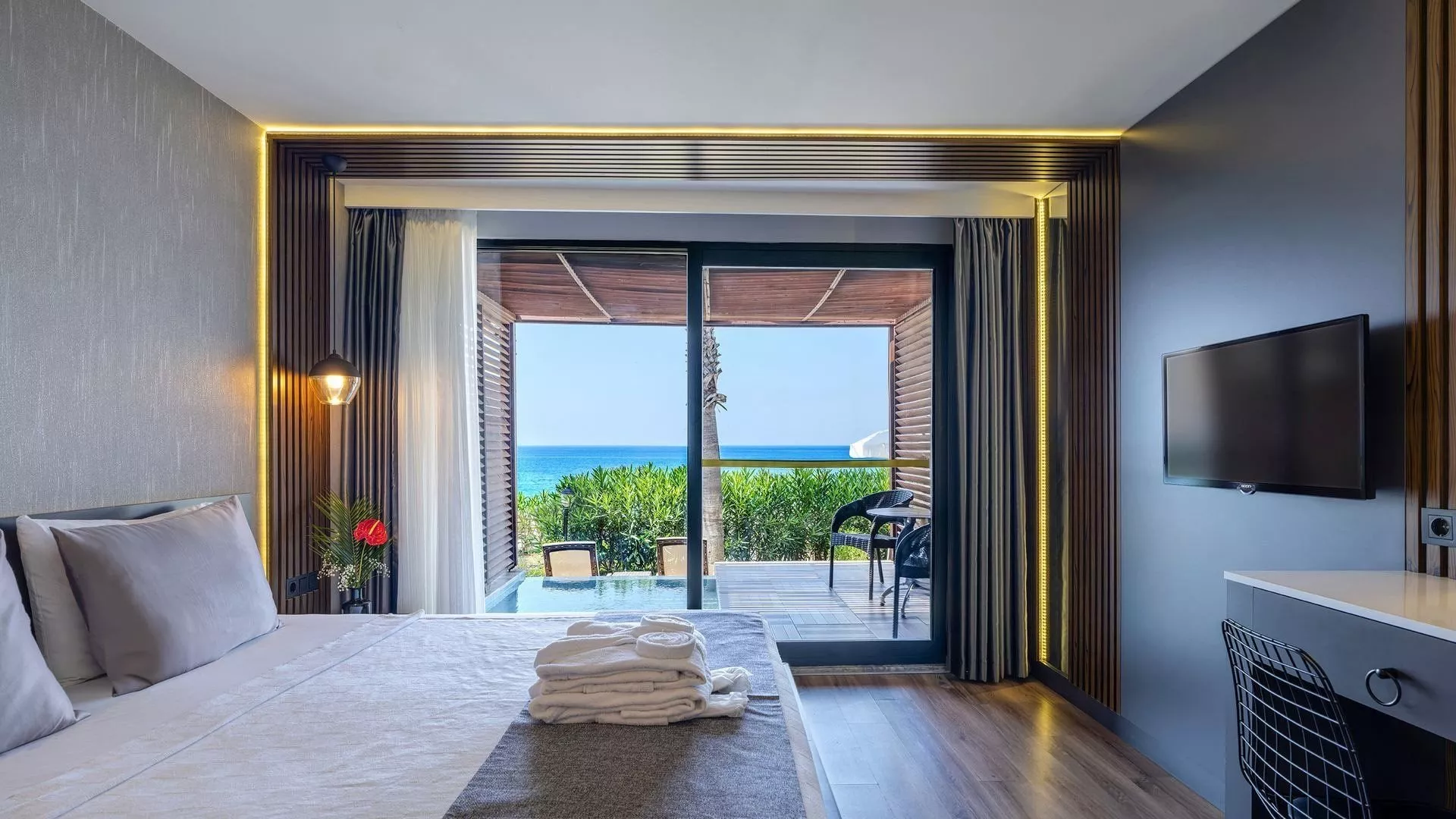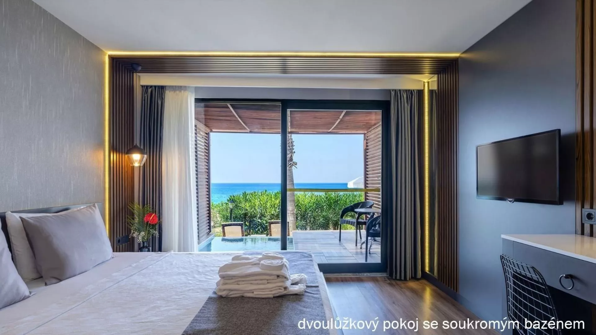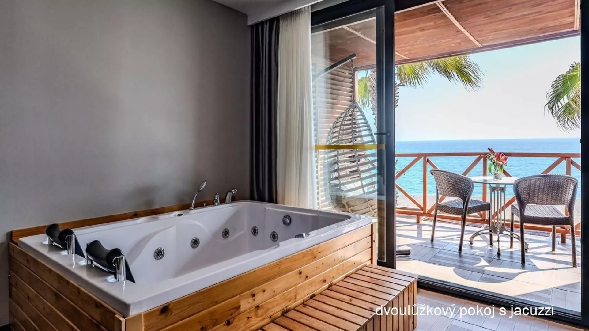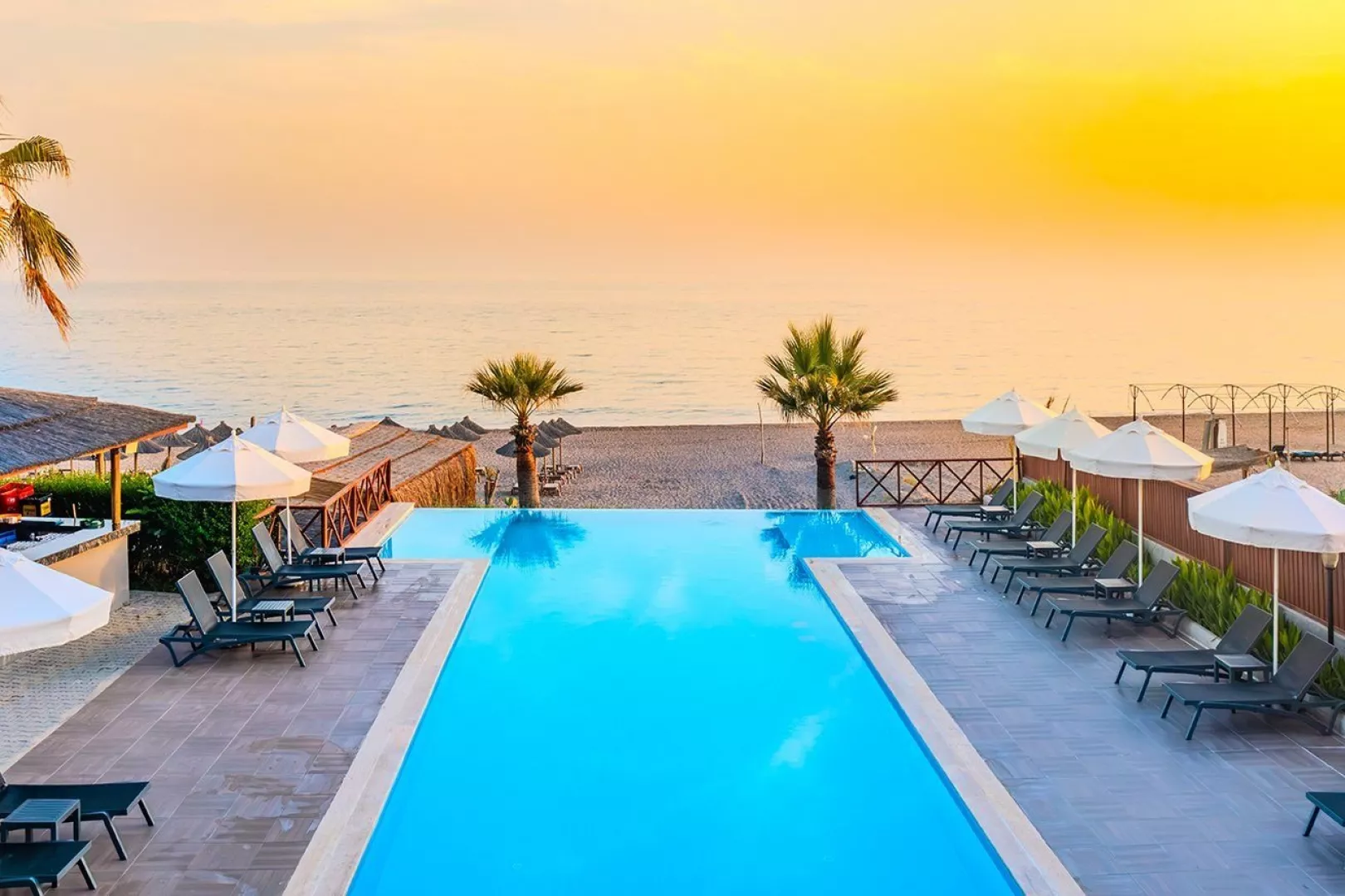 Hotelová pláž je súkromná, s piesočnatým a okruhliakovým povrchom. K dispozícii sú ležadlá a slnečníky zdarma, plážový bar a pavilóny na pláži. Izby s vlastným bazénom a jacuzzi poskytujú extra pohodlie.