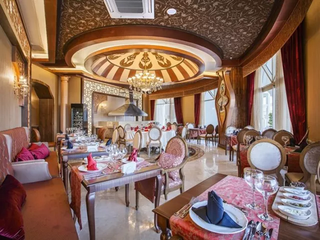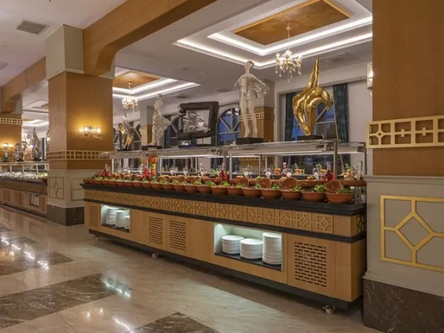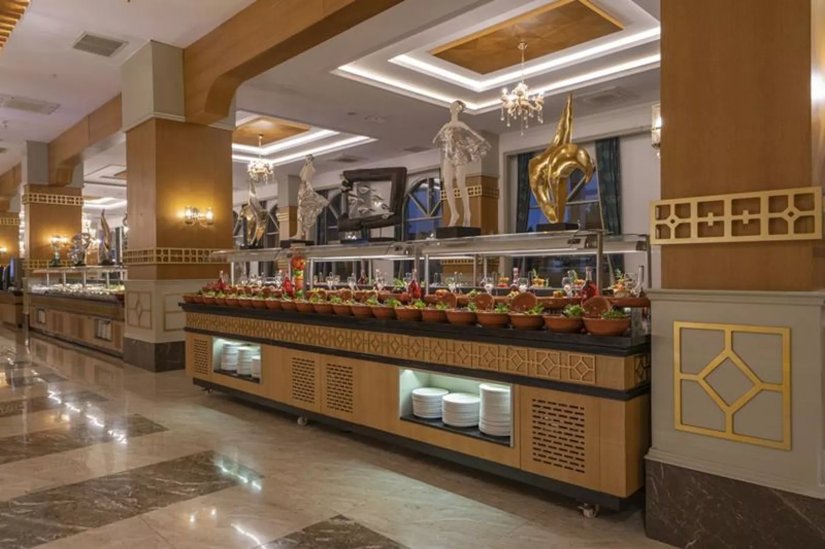 Hotel ponúka stravovanie formou ultra all inclusive s bohatým výberom jedál v bufetovej reštaurácii a viacerých á la carte reštauráciách, ktoré je potrebné rezervovať vopred. Stravovanie zahŕňa raňajky, obedy a večere, ako aj občerstvenie počas dňa, vrátane zmrzliny a tradičných tureckých raňajok.