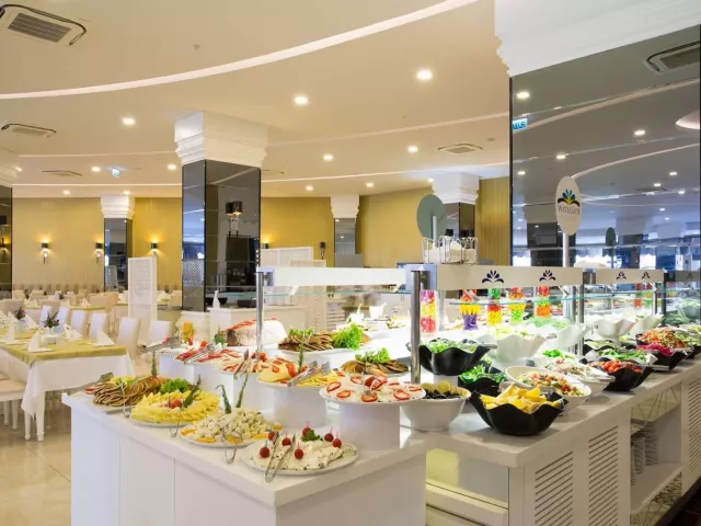 • Hlavná reštaurácia a 3 à la carte reštaurácie (rybacia, talianska, turecká, jedna z nich je raz za pobyt zadarmo, nutná rezervácia)