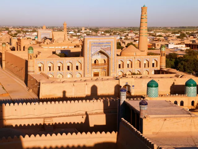 BUCHARA-CHIVA-ITCHAN KALA Rýchlovlak je už náš starý známy. Dnes vyskúšame najnovší úsek medzi Bucharou a odľahlou púštnou oázou Chiva. Je pozoruhodné, ako sú všetky mestá Hodvábnej cesty v Uzbekistane odlišné. Ak Samarkand a Buchara boli veľkými mestami, kde cítiť stopu kráľov, cisárov a emirov, tak Chiva je mestom chánov a kmeňových náčelníkov. Naozajstná oáza na Hodvábnej ceste. Ak by miestni nosili dlhé kaftany a brnenia, okamžite by ste uverili, že ste sa preniesli stovky rokov do minulosti. Desaťmetrové múry obkolesujú perfektne zachovalé staré mesto Itchan Kala s minaretmi, hrobkami, palácmi a mešitami. Čaká nás pompézna brána Ata-Darvaza, 15 metrov vysoký minaret Kalta , symbol orientálnej architektúry, alebo palác chána Allakulihana Tash Hauli s háremom pre 40 konkubín. Ulice sú plné tovaru a čajovní. Karavány akoby nikdy neodišli. Už len prechádzka je tu zážitkom.