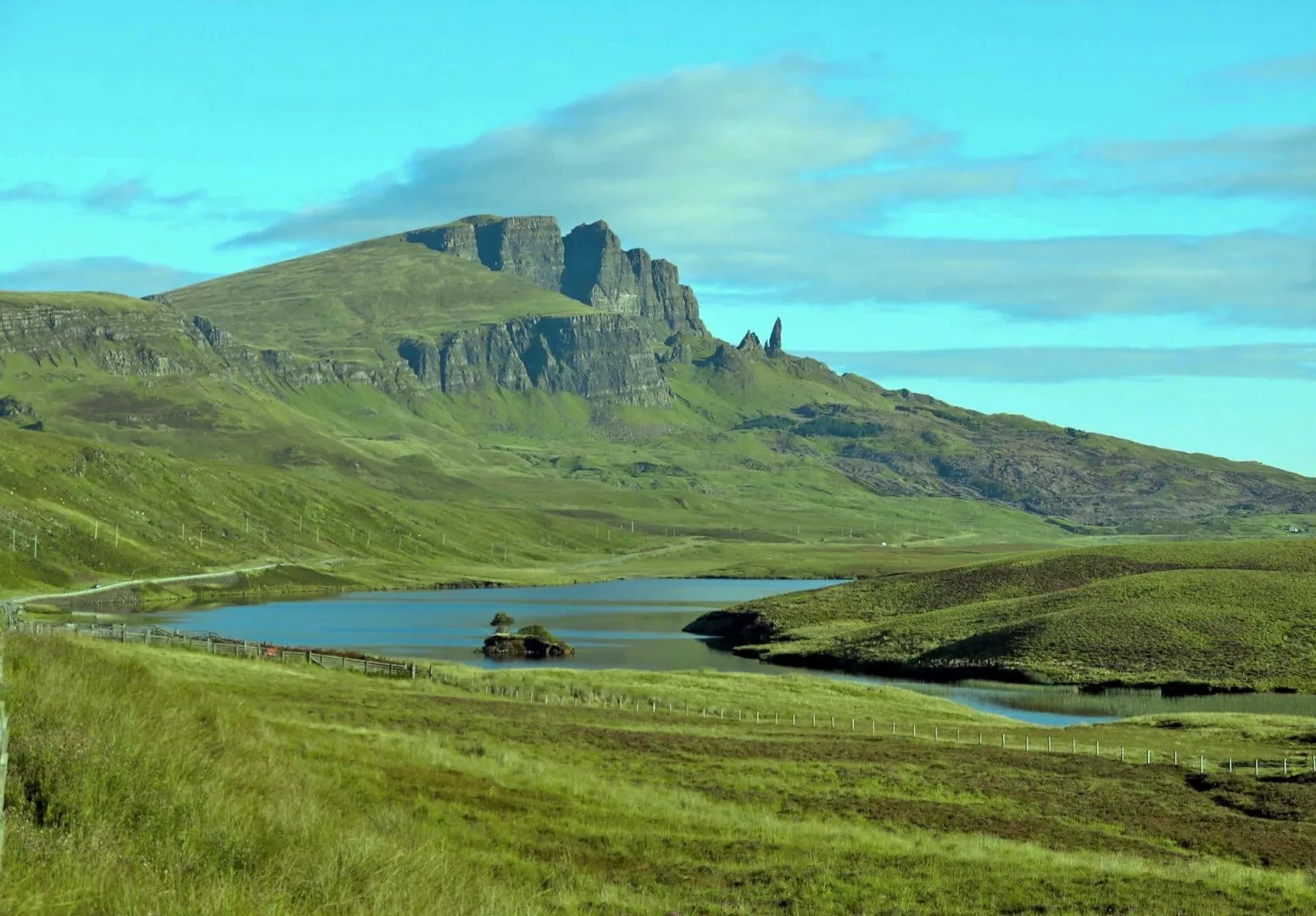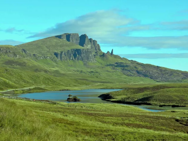 OSTROV SKY - DUNVEGAN CASTLE Ostrov Skye , najväčší ostrov Vnútorných Hebridov, je považovaný za najdivokejší, najdrsnejší a zároveň najkrajší zo škótskych ostrovov. Čaká nás bizarná krajina polostrova Trotternish, podivuhodný terén plný kamenných ihiel a veží – Quiraing, 49 m vysoký monolit Old Man of Storr , jedinečné útesy Kilt Rock , ostrovný skanzen, hrad Dunvegan Castle , sídlo vodcov klanu Mc Leodovcov a farebný prístav Portree, prístav kráľa.